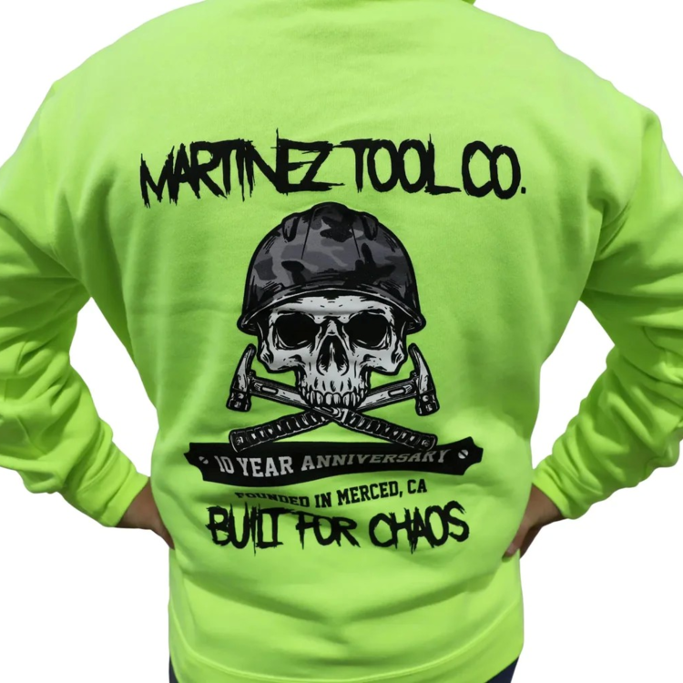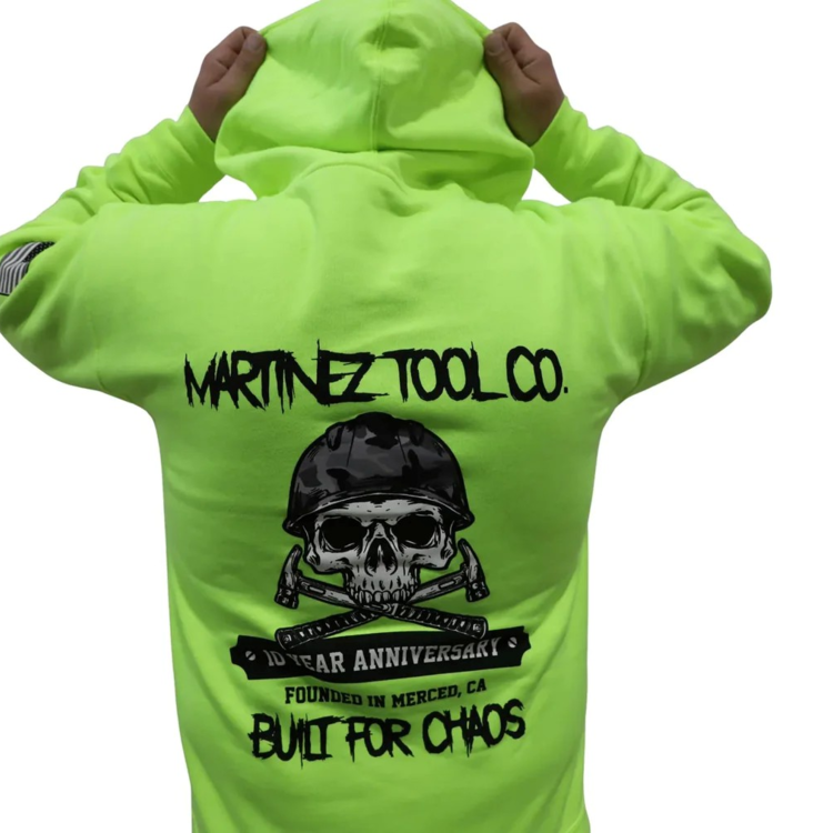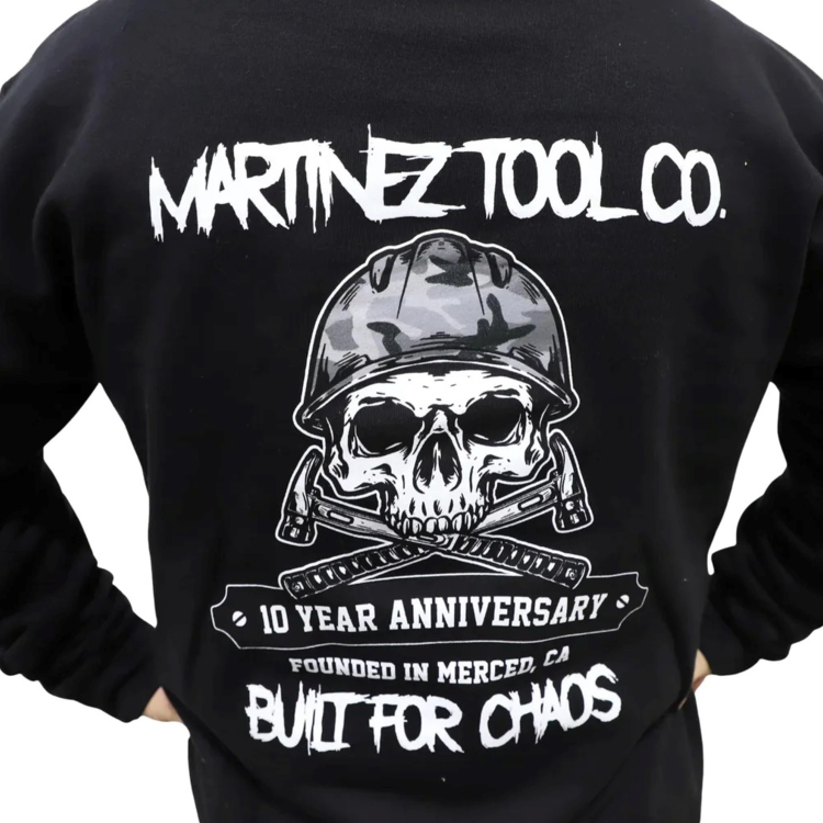 마르티네즈 툴스 10주년을 기념하는 후드티입니다. 이 후드티는 왼쪽 가슴에 유명한 마르티네즈 "M"과 뒷면에 "혼돈을 위한 빌드" 로고가 새겨져 있습니다. 물론 왼쪽 소매에는 미국 국기가 있습니다!